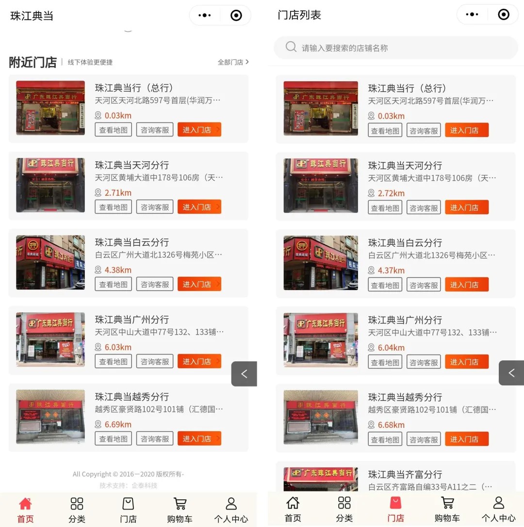 在首页附近门店和导航栏门店里,您查看珠江典当九家门店信息,并实时提供您到门店距离和导航,点击进入门店还可查看该门店商品哦~