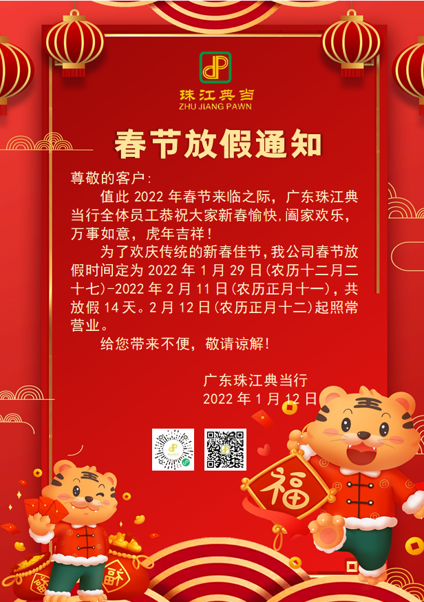 广东珠江典当行2022年春节放假公告