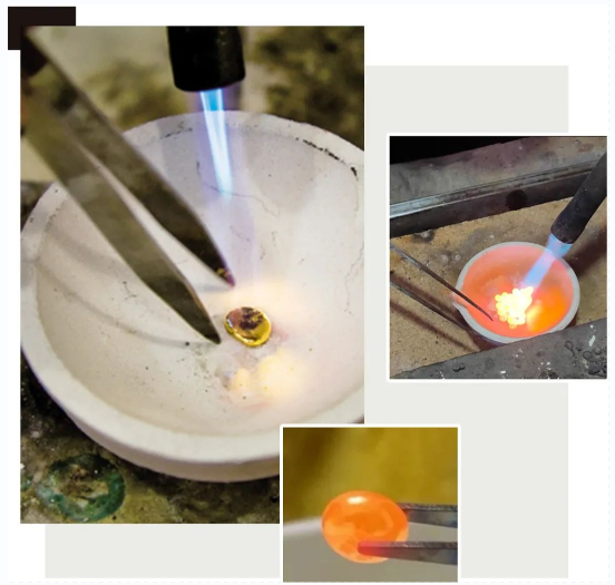从专业角度上讲,一个1g的“金豆豆”,它的工艺水平其实并不高。那圆圆的形状就是热熔枪融化以后,黄金呈现的自然形态,无需压制等工序,最后再加上印记就是成品了。