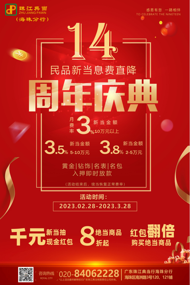 珠江典当海珠分行14周年庆 | 钜惠来袭 · 礼献全城,现金红包100%中奖