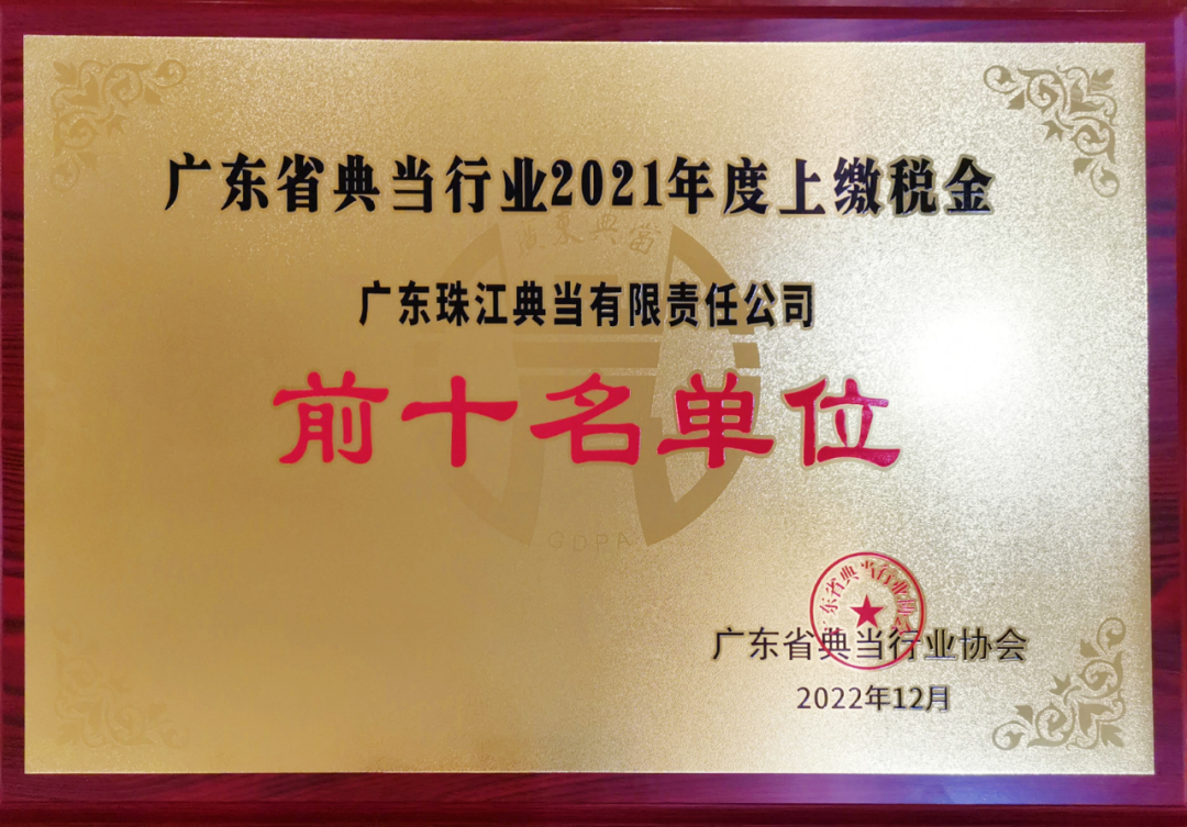 热烈庆祝广东珠江典当行荣获广东省典当行业“2021年度上缴税金前十名单位”称号!