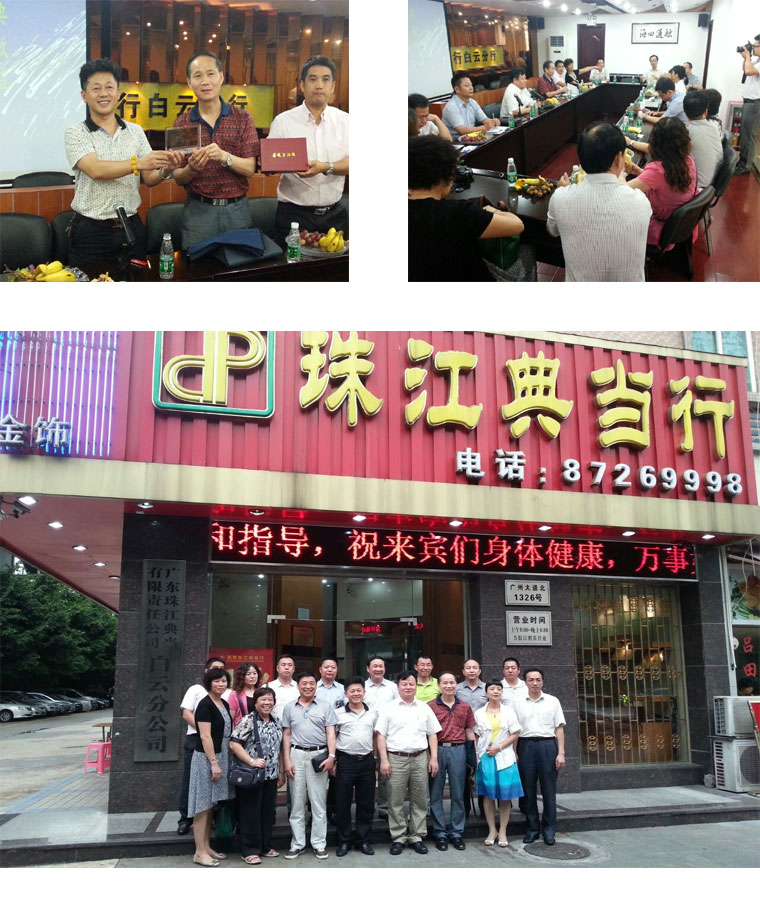2013年7月19日下午,河南省典当行业协会冯俊敏常务副会长一行在广东省典当行业协会会长张曙、副会长陈子红及秘书长吴美嫦等陪同下来珠江典当行考察和交流,广东省典当行业协会副会长、广州市典当行业协会会长、珠江典当行董事长杨志伟热情接待了冯会长一行。两地典当同仁分别介绍了各地的典当发展状况和一些好的经验和做法,并就当前的典当融资环境、典当业务创新、风险把控及典当业的未来发展等方面进行广泛和深入的探讨和交流。