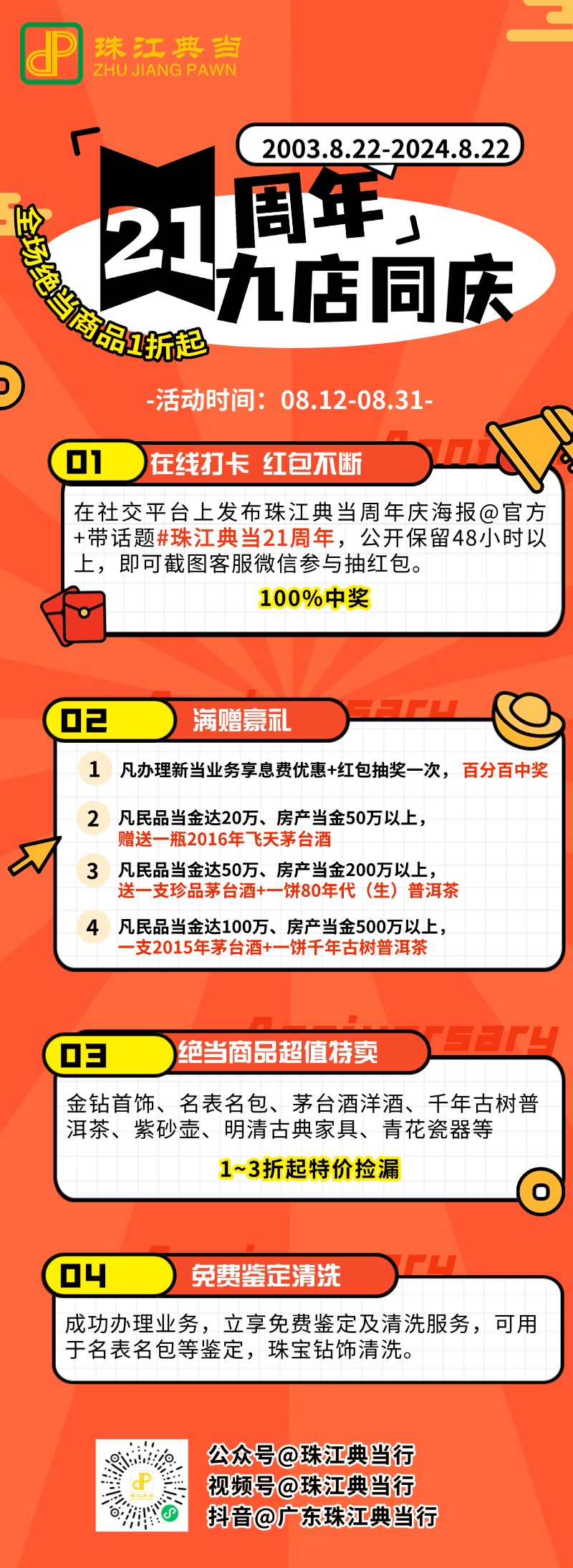 珠江典当行21周年(2003.8.22~2024.8.22),九店同庆钜惠全城