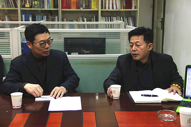 市工商局专业市场管理分局书记方新宇(左一)与市协会会长、珠江典当行董事长杨志伟(右一)交流工作