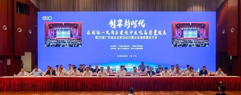 2019年5月29日,由广东省企业联合会、广东省企业家协会主办,主题为“创享新时代,在国际一流湾区建设中实现高质量发展”的广东省企业家活动日暨企业诚信建设大会在广州白云国际会议中心岭南大会堂隆重举行。省人民政府副省长覃伟中,省政协副主席袁宝成,中国企业联合会、中国企业家协会常务副会长朱宏任,省政府有关部门领导,广东省企业联合会、广东省企业家协会领导和来自全广东省各行业近千名企业家代表参加了会议。