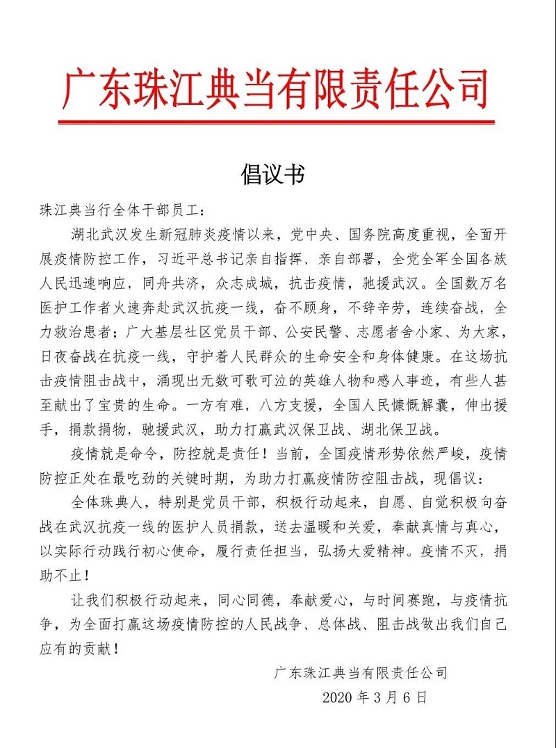 全体珠典人,特别是党员干部,积极行动起来,自愿、自觉积极向奋战在武汉抗疫一线的医护人员捐款,送去温暖和关爱,奉献真情与真心,以实际行动践行初心使命,履行责任担当,弘扬大爱精神。疫情不灭,捐助不止!