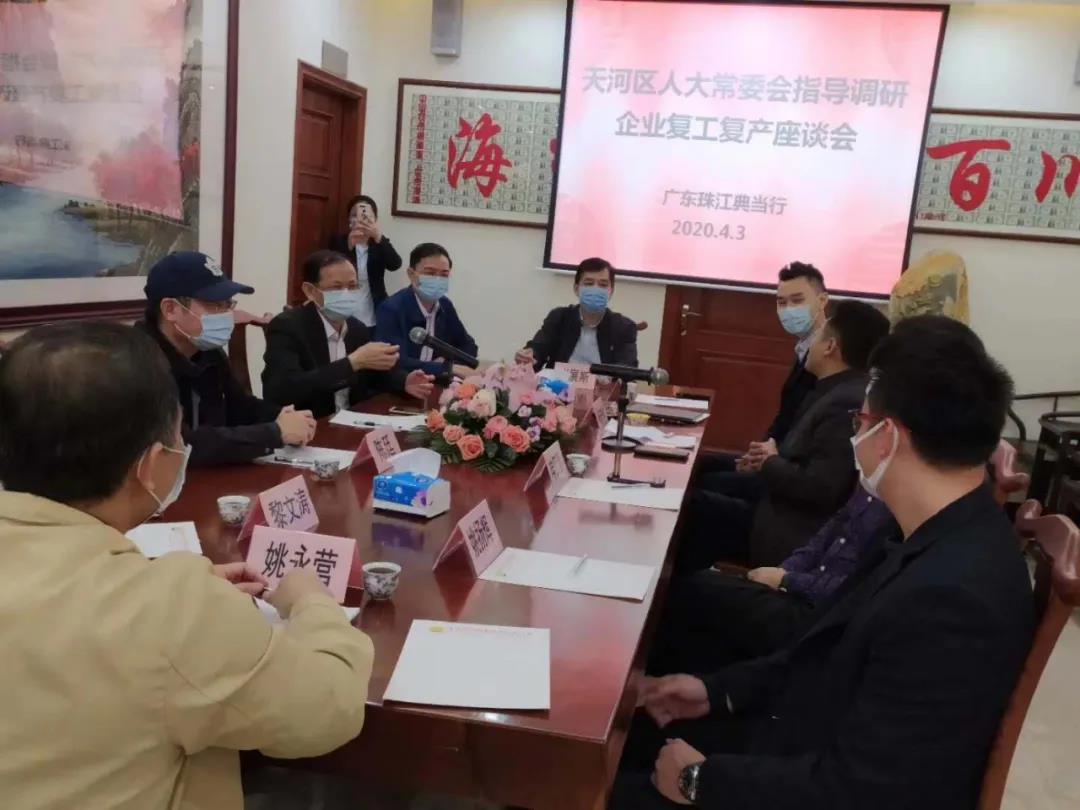 4月3日,天河区人大常委会副主任李日华一行莅临广州市人大代表杨志伟所属企业广东珠江典当行指导调研复工复产工作,广州市人大代表、广州市典当行业协会会长、广东珠江典当行董事长杨志伟主持召开座谈会,天河区人大常委会农村农业工委主任陈廷,财政经济工委主任黎文涛,车陂街党工委书记曾东标,车陂街人大工委书记姚永营,区人大代表、车陂街监察室负责人张展斯,珠江典当行副总经理申又喜等参加了会议。