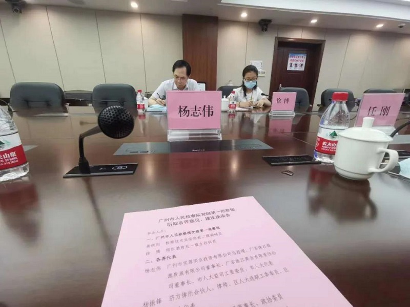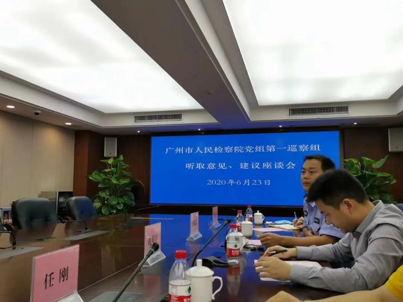 2020年6月23日下午,广州市人民检察院党组第一巡察组听取各界意见建议座谈会在天河区检察院召开。市人大监察和司法委委员杨志伟和部分天河区人大代表、政协委员、人民监督员,天河公安分局法制大队、预审大队负责人及律师参加会议。会议由巡察组副组长黄晓阳主持。