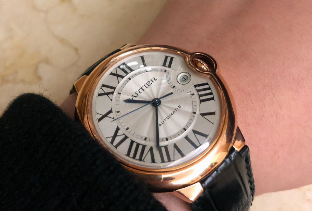 玫瑰金蓝气球表壳上下形成一个巨大的曲面,表壳边缘薄,中间厚。