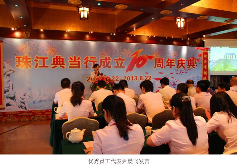 珠典十年,我一步一步成长,从当初对典当完全是门外汉的普通基层员工到现在非常荣幸地担任总行营业部副经理,是公司董事会及杨董事长对我的无比关怀和信任,我万分感谢公司对我工作、学习和生活上的关怀与帮助,万分感谢公司对我的培养和锻炼,今天我取得了一点成绩,收获了很多,我一定会牢记“吃水不忘挖井人”这一古训,十年来,我一直把“珠典”当做自己的家,把“珠典”的工作当成自己的事业,与珠典同甘共苦,不离不弃,像珍惜自己的生命一样珍惜珠典,我无比热爱珠江典当,今后,我将继续发挥高度的主人翁精神,爱行如家,勤奋敬业,奋发进取,共创辉煌,让我们携手奋进,为珠典更美好的明天而努力奋斗!为全面实现珠江典当行第三个五年发展蓝图和“一流品牌、百年老店、幸福珠典、和谐共荣”的珠典梦而奋斗终生!