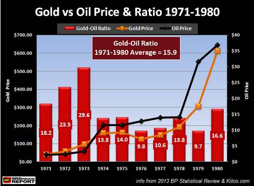 1961-1970年,黄金/原油平均为20.0,意味着1盎司黄金可以换20桶原油。