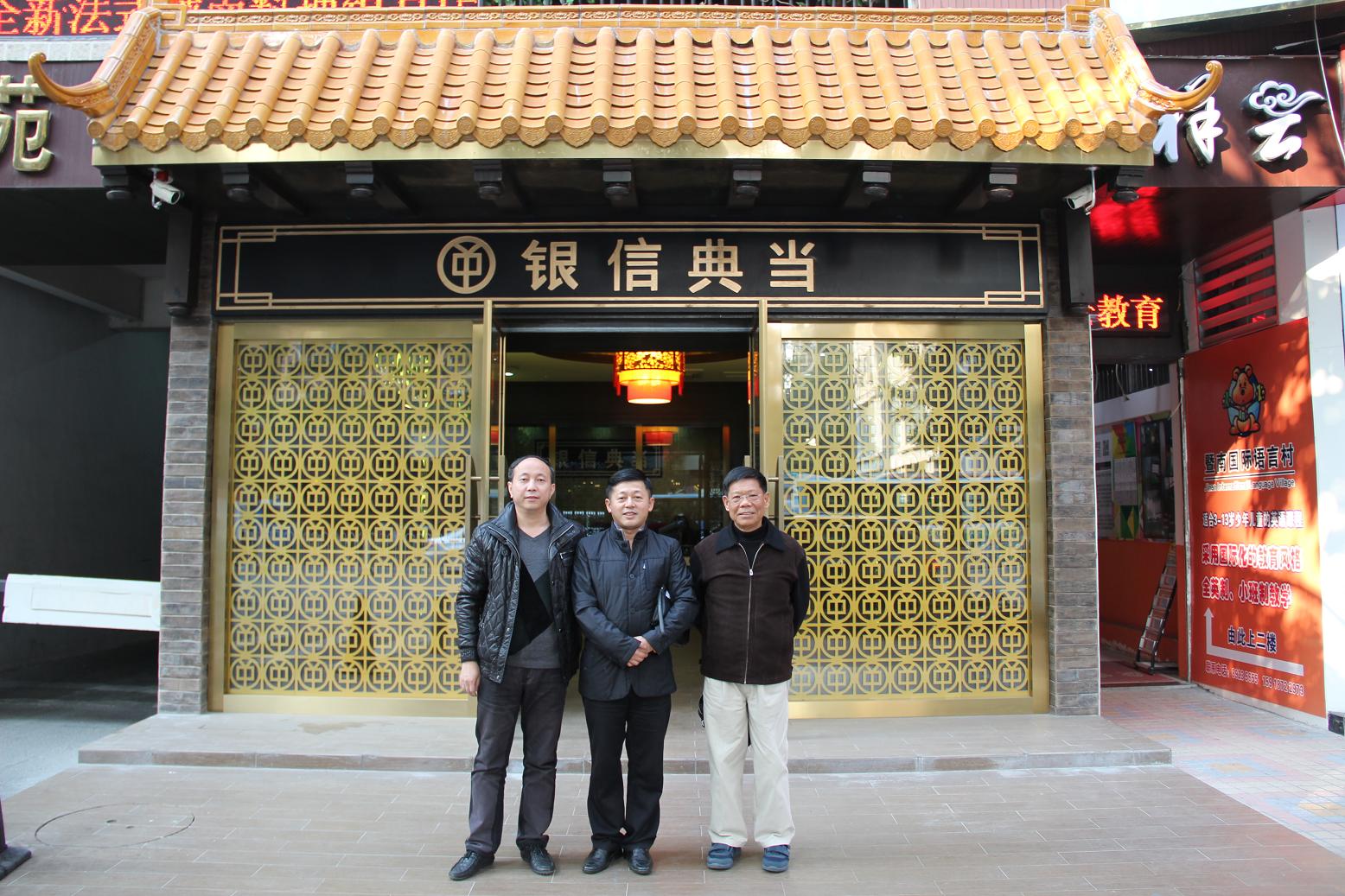 杨志伟会长(右)与汪洋总经理(左)座谈交谈 杨志伟会长(中)与汪洋总经理(左)于银信典当门前合