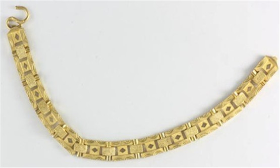 黄金珠宝检测中心在检测客户送检的黄金时,也曾检测到含铱手链:手链车花部分是倒模出来后,再用玛瑙刀手工抛光,从细节可以辨别与传统车花工艺不同,不及车花工艺平整、光亮;而且由于含铱材料不易抛光,抛光后容易有黑洞、白点,所以该手链采用磨砂工艺,不易观察。此外,为达到最大利益,含铱首饰一般都使用大块倒模,款式总重量大。