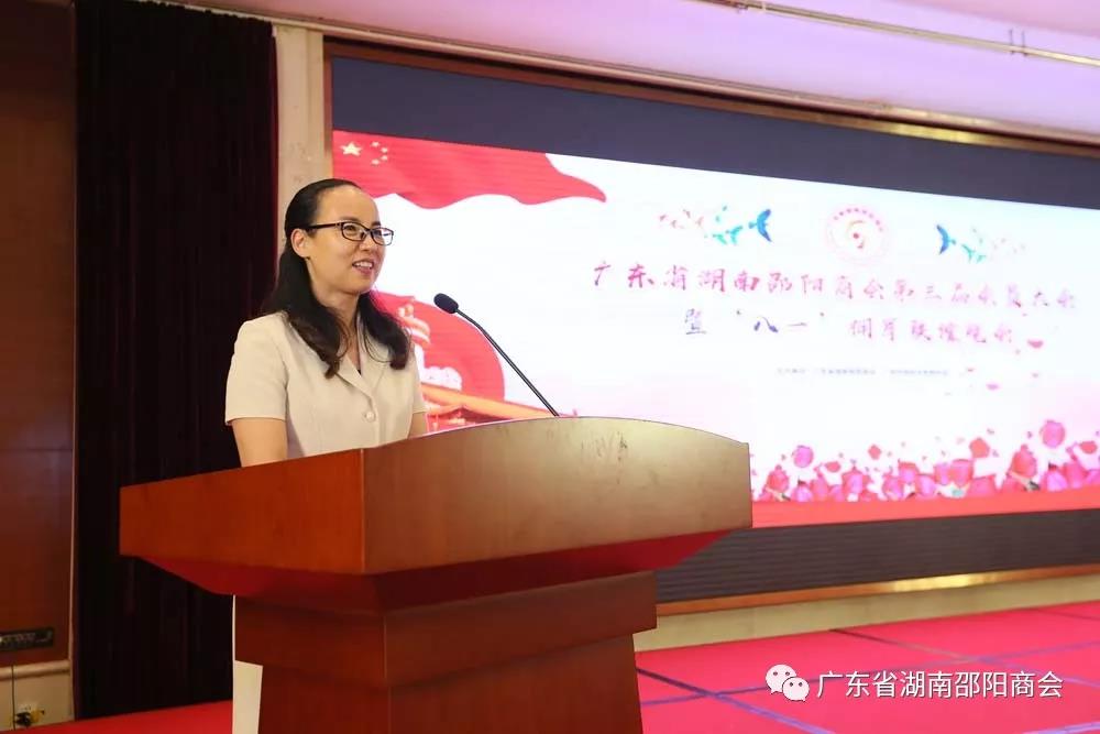 邵阳市晏丽君副市长在会上作了讲话。她表示,近年来广东省湖南邵阳商会各方面工作都取得了令人瞩目的成绩:自身建设有新发展,社会影响有新突破,回报家乡有新成果。当前,邵阳立足特色优势,准确把握新经济发展的新趋势,聚焦重点精准发力,提出四大主攻方向,打造出新的动力引擎,即“新制造经济”、“新服务经济”、“智慧经济”和“分享经济”。期待在粤邵商和广大关心邵阳发展的企业家抓住机遇,发挥优势,进一步支持邵阳、推介邵阳、投资邵阳,共同打造美丽中国的“湖南样板”。并希望在邵商争当江右商帮精神的传承者,争当新经济的引领者,争当回报家乡的践行者。