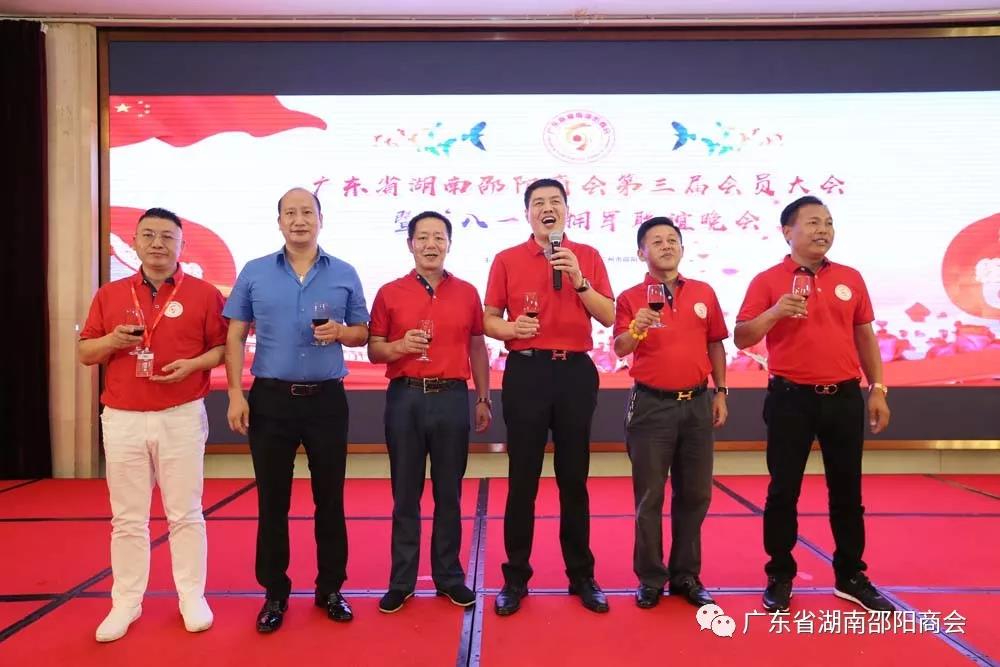 2018年7月29日,广东省湖南邵阳商会第三届第一次会员大会暨“八一”拥军联谊会在珠江宾馆召开。原广州军区副政委张国初中将,总装备部原副部长肖贞堂中将,原广州军区副参谋长袁邦根少将,原广州军区联勤部副部长袁源少将,保利地产创始人、原董事长李彬海,广州市人大城建委原主任、终身名誉会长赵庆华,邵阳市副市长晏丽君,邵阳市人民政府副秘书长王成章,中华邵商联合会荣誉主席张辉,中华邵商联合会主席邓天骥以及邵阳市政府聘任的部分专家顾问领导,邵阳籍在粤的领导专家学者,兄弟商会会长及秘书长等近400位在粤邵商企业家出席晚宴。