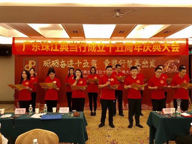 8月22日,在珠江典当行成立十五周年庆典大会上,员工代表们集体表演了配乐诗朗诵《典当之春》。