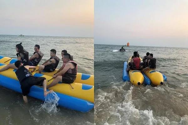 在凤山顶俯瞰汕尾市区全貌和领略蔚为壮观的凤山祖庙旅游区山水景色后,下午,大家来到金町湾精品海滨小城。办完入住手续后,大家纷纷忘却了旅途的疲劳,抑制不住来到海边的兴奋直奔海滩而去。海风习习,潮来汐往,呼吸着略带咸味的海风,大家尽情享受自然的馈赠;踏浪、戏水、捡贝壳、海滩漫步、拍照、参加水上项目、看日落……欢声笑语洒满了整个海滩。